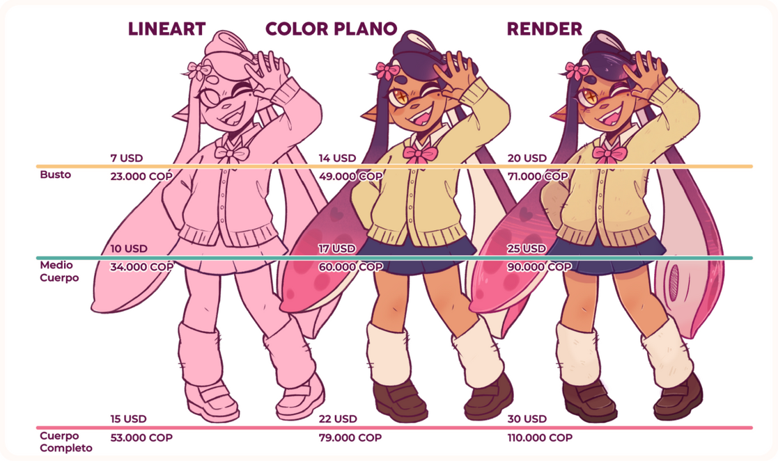 Las comisiones completas serán posteadas a mis redes sociales. Si no desea que el dibujo sea compartido, ¡por favor déjemelo saber!